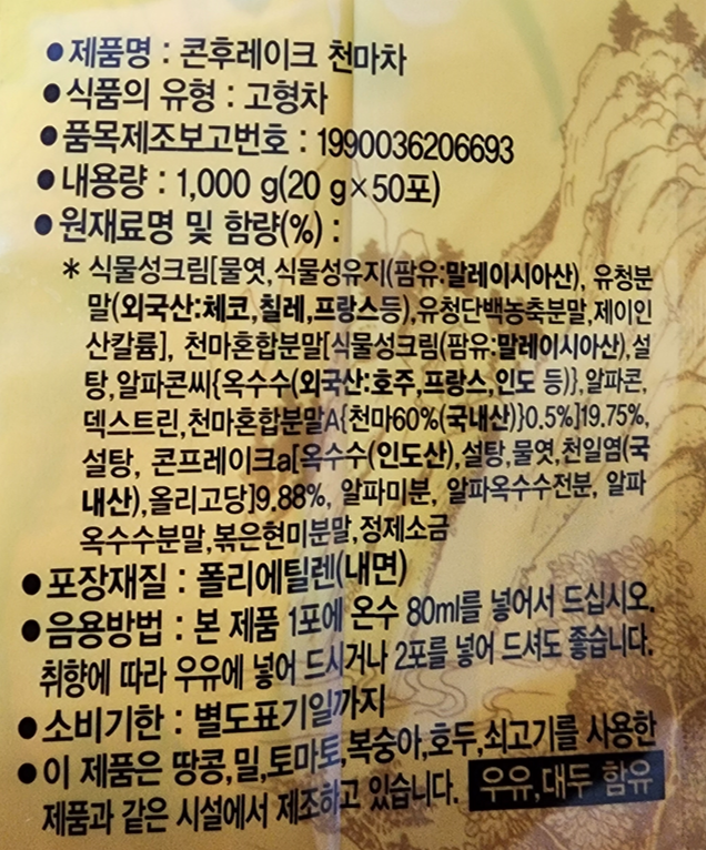 Dongil Corn Flakes Gastrodia Tea is a unique Korean wellness beverage combining crispy corn flakes with gastrodia root. This pack includes 50 sticks of 20g each, offering a lightly sweet, crunchy texture with traditional herbal benefits. Known for supporting relaxation and brain health.