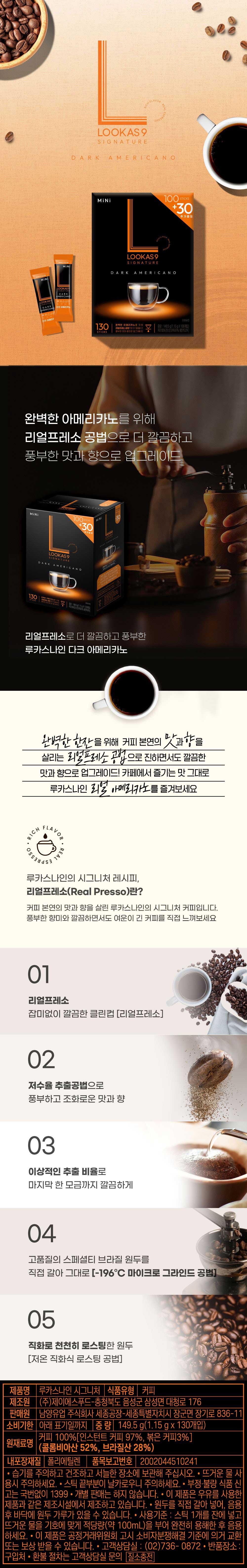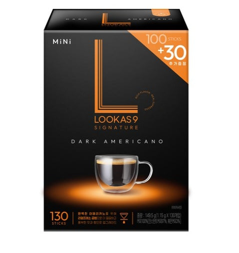 LOOKAS9 Signature Americano Mini Stick is a value pack with 130 convenient mini sticks of 1.15g each. Choose from 2 types: Mild Americano for a smooth, balanced taste or Dark Americano for bold, intense coffee flavor. Perfect for coffee lovers who want quality instant coffee in bulk.