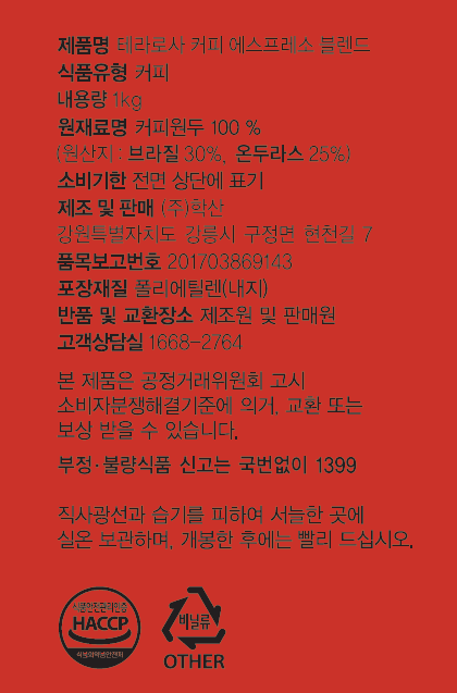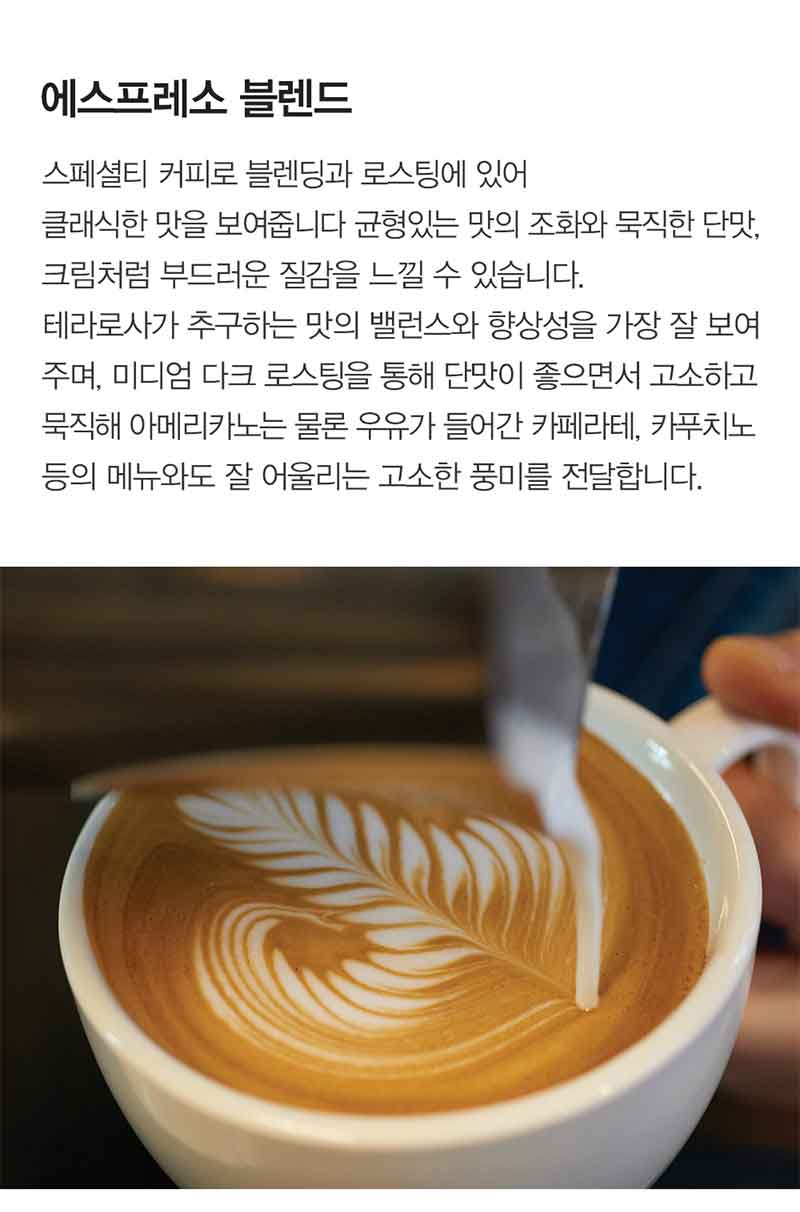 TERAROSA Espresso Blend Whole Beans is a premium 1kg package of specialty-grade coffee beans from Korea's renowned roaster. These whole beans (not ground) are expertly blended for rich espresso with balanced acidity and smooth body. Perfect for home baristas and coffee enthusiasts seeking café-quality espresso.